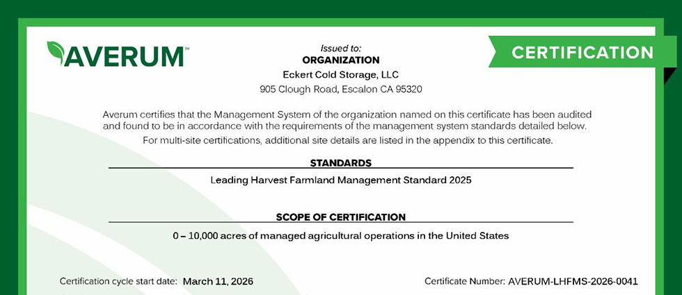 Eckert’s audit was conducted by Averum, an ISO 17021-1 accredited certification body, whose auditors spent several days between the growing fields and reviewing management systems to validate growers’ practices and record keeping.